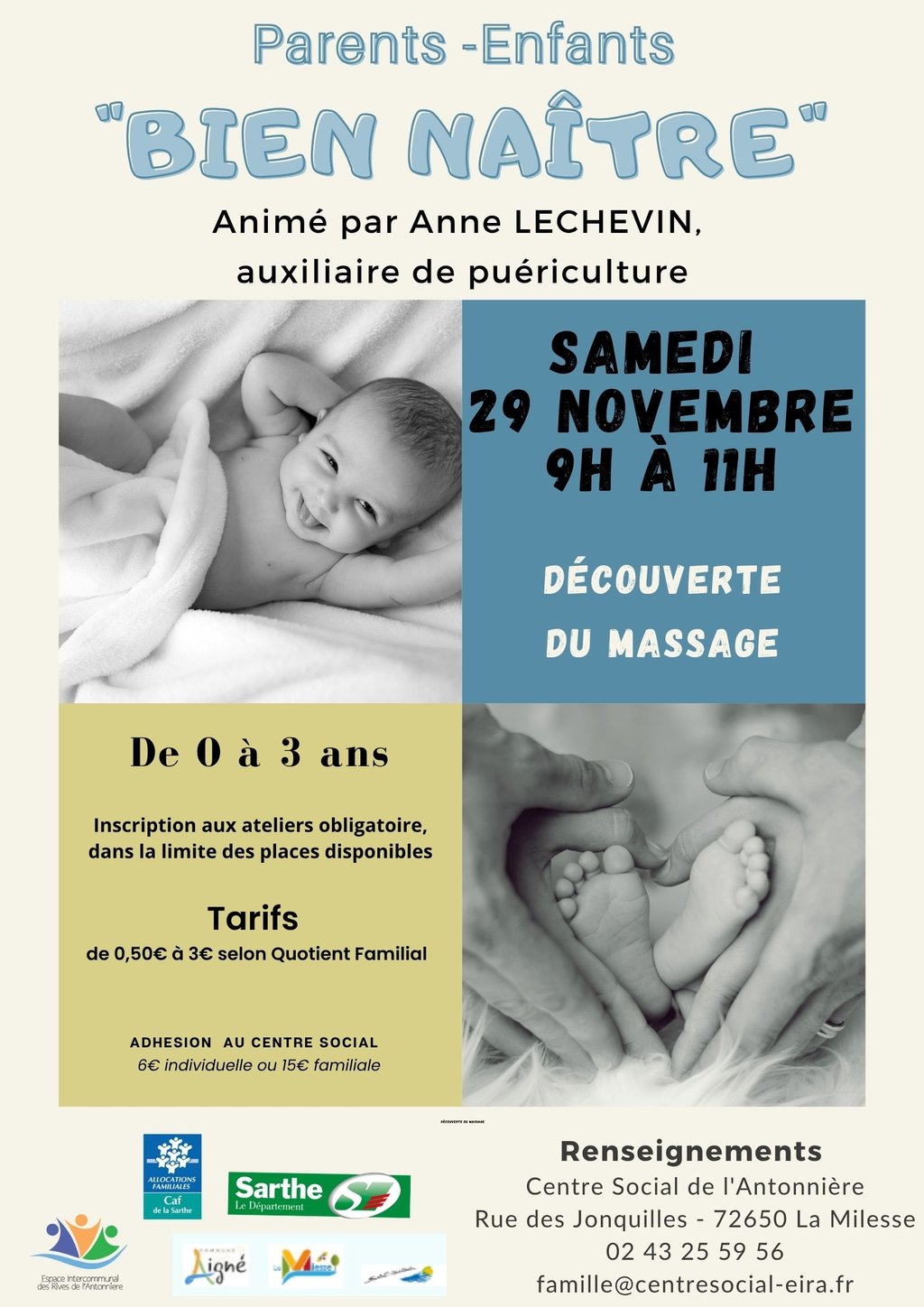 📅 L’atelier Parents-Enfants "Bien Naître" – Découverte du massage, initialement prévu le mercredi 8 octobre, est reporté au samedi 29 novembre, de 9h à 11h 🕘✨