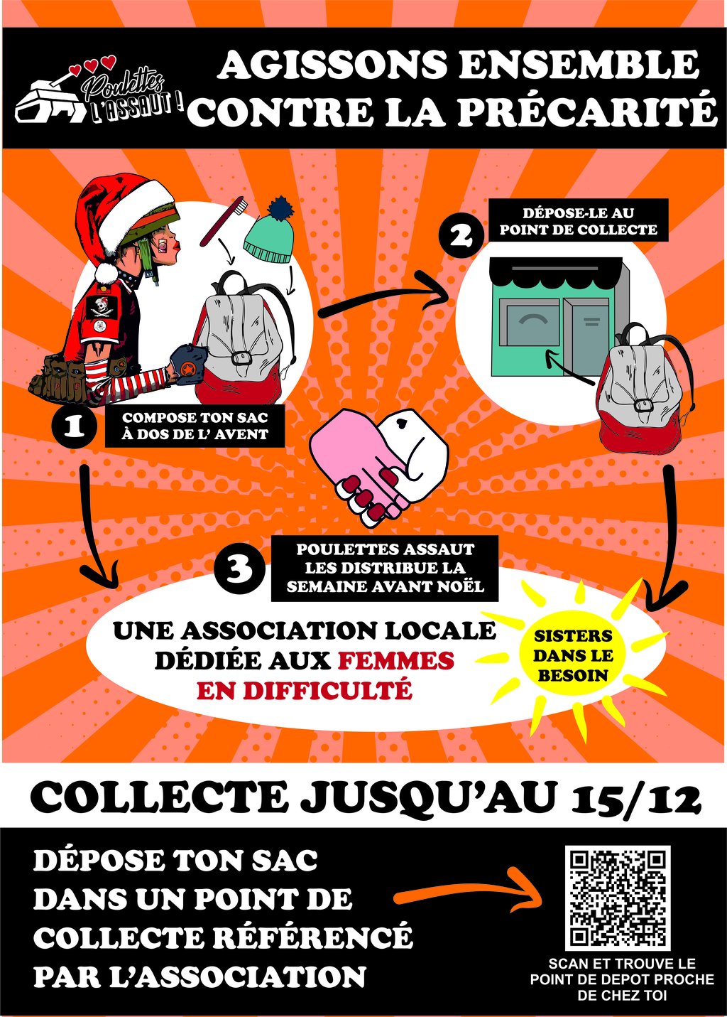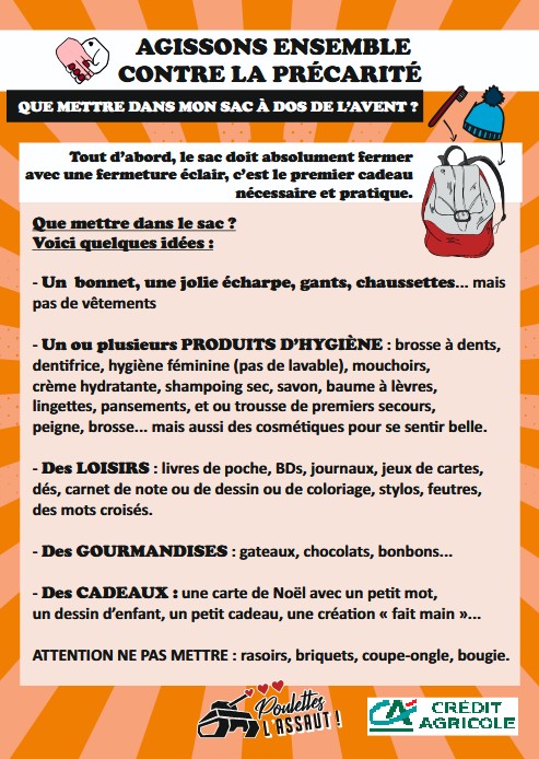 Pour la 5ème année l'association tourangelle "Poulettes l'Assaut" organise, sur toute la France, l'opération solidaire "sacs de l'avent" visant à récupérer des sacs à dos remplis de petites attentions pour apporter un peu de chaleur humaine aux femmes logées dans les centres d'hébergement d'urgence pendant les fêtes.