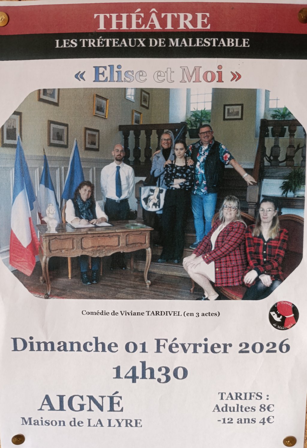 La troupe "Les Tréteaux de Malestable" vous propose une représentation de la pièce de théâtre de Viviane Tardivel "Elise et Moi", le :