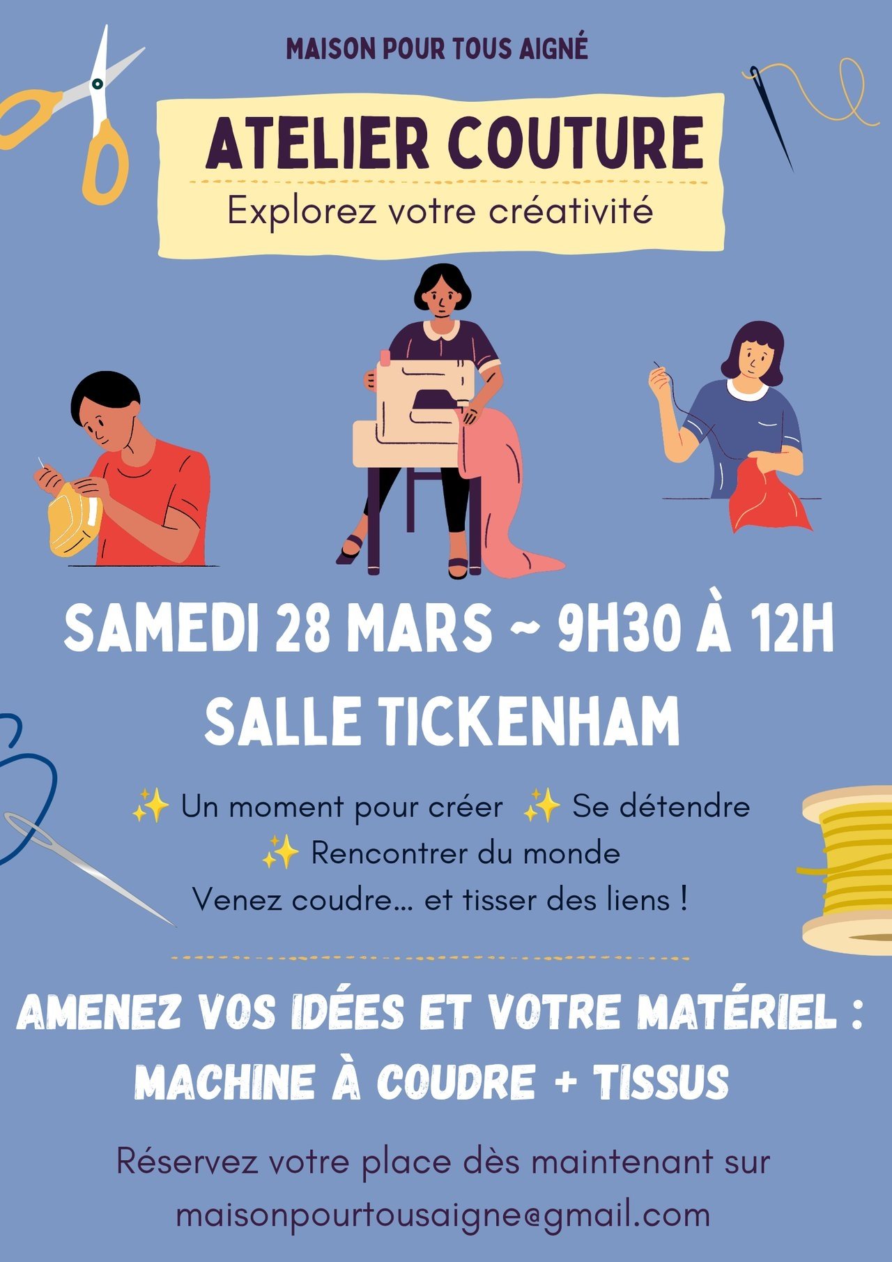 Cet atelier aura lieu à la salle Tickenham. Nous ne savons pas exactement le nombre de personne que nous pouvons accueillir dans les meilleurs conditions. Alors nous vous invitons à réserver votre place en écrivant à "maisonpourtousaigne@gmail.com"