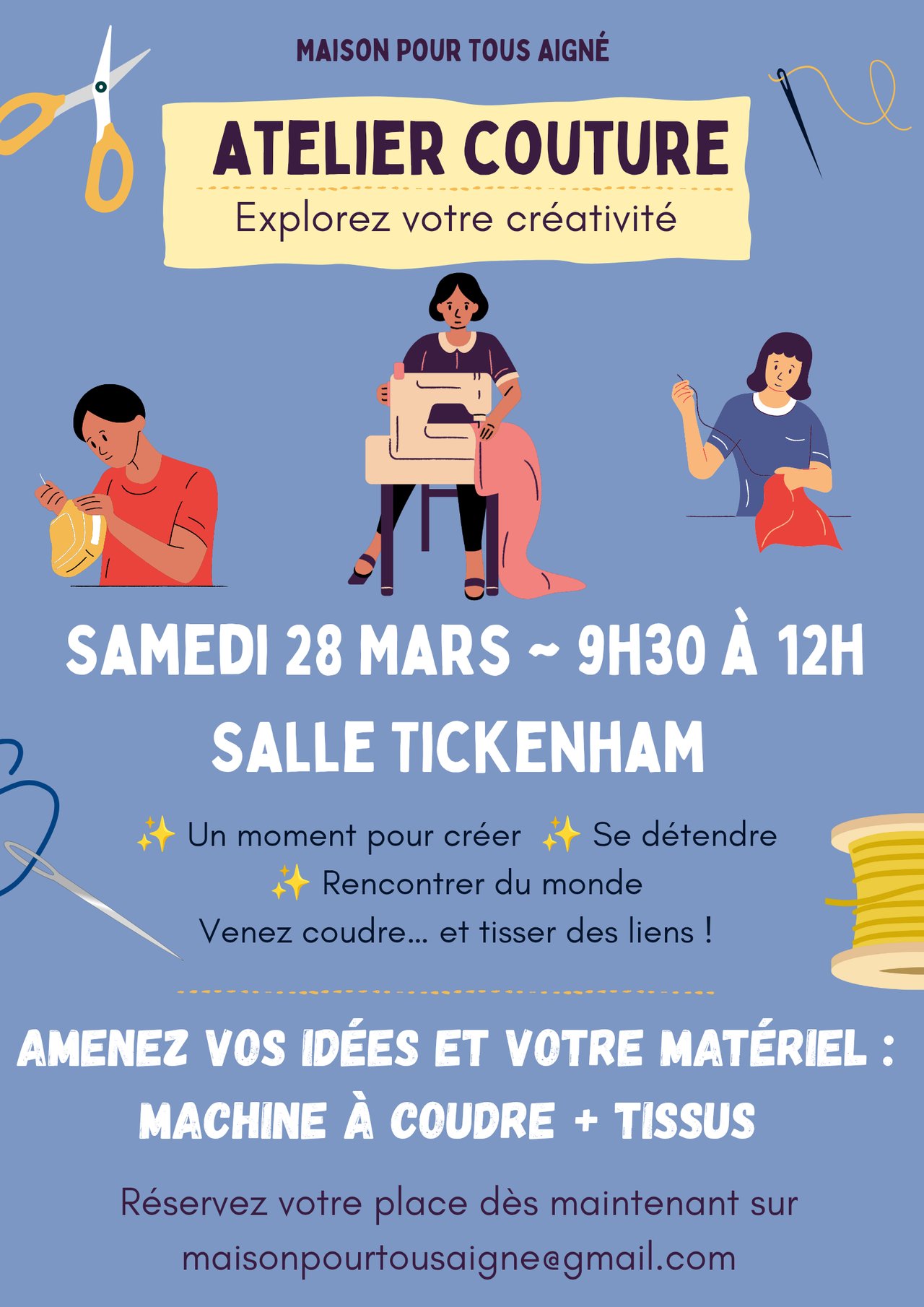 Des habitant(e)s d'Aigné, dans le cadre du collectif "ACCLA - Maison Pour Tous" vous propose un atelier couture le samedi 28 mars, de 9h30 à 12h00.